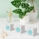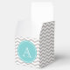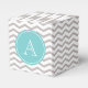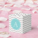Favour box with grey and white chevron pattern, on top of which, is a blue circle with monogram. © Mood 4 Cute