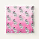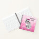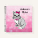 Cute hand drawn cartoon cat that is grey and white with a pink bow personalised notebook. Cute gift for a little girl or a teen.