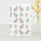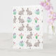 Designed with a repeating spring pattern, this card features stylized long-eared rabbits in soft gray, with blush-pink inner ears and tiny rosy cheeks 🐰. Some pairs face each other with a tender, friendly lean, as if sharing a quiet secret, while others look outward to invite the viewer in. Between them sit clusters of spring flowers, including closed pink blooms touched with yellow and small lavender blossoms that feel gently fresh 🌷. Several of the purple flowers are framed by a faint pale-blue circle, like a soft halo of morning dew. The background stays very light, letting the pastel animals and flowers stand out without feeling busy. Small polka dots in yellow, light blue, and pink are scattered throughout like confetti or new buds. No headline text appears, leaving the pattern to fill the front with rabbits, flowers, and dots evenly spaced across the surface.