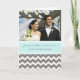 Photo Just married announcement card with elegant light pastel turquoise sky blue, grey and white casual and retro chevrons zigzags stripes pattern, unique and stylish, customisable with your names, your own photo, and wedding date, the perfect way to share your happy news with family and friends.