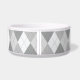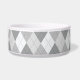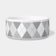Argyle type pattern in grey colour scheme. There is also a black dog bone shaped banner with a personalizable text area for a name or other custom text such as "food", "dinner" or "water".