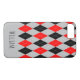 An iPhone 7/8 case designed with a grey, black and red argyle pattern. Customise the iPhone case with your name or text among other options.