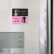 A reminder to feed the cat and let others know that the cat has been fed. Simply turn the magnet around when the cat has been fed in the morning or evening. The evening side has a grey cat with a pink star hanging from their tail. The morning side has a black cat with a green star hanging from their tail. The background is black and pink.