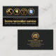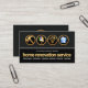 A grey and black layer is demarcated by a white line near the card's centre. Just below the line is a slogan caption option for you to publicise your services, followed by the business name and the type of services. You can change the caption remarks to the slogan and the service list to suit your own needs. Over at the top are four creative gold icon logos that can represent some of the work you might offer e.g. the gold hammer is for carpentry and renovation works, the roller brush is for home painting, the home bulb logo is for electrical works and lastly the blue faucet home icon is for plumbing.