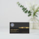 Overleaf, the same design theme is used with the logo at the top corner and the business name just above the gold stripe. The black column underneath has your contact details and slogan option to publicize your services.