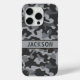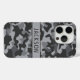 Customise this grey camouflage iPhone 15 pro case with your name in a trendy modern CAP font in dark grey on light grey. It's masculine and perfect for your favourite military, hunting, country or outdoorsman!