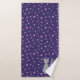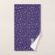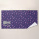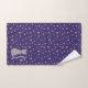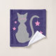 A set of towels with a grey cat on a purple background. The two larger towels have the cat in the corner with a pink star pattern on the rest of the towel. The washcloth has the cat as a central design.