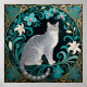 Indulge in luxurious elegance with this majestic grey tabby cat centred in an opulent Art Nouveau-inspired frame. Rich teal foliage, swirling golden vines, vibrant turquoise orchids, pristine white lilies, and delicate blue blossoms encircle the serene feline in intricate, gilded detail against a deep midnight background. The luminous eyes, soft fur texture, and harmonious jewel-toned palette create a sophisticated, enchanting, and timelessly romantic mood — perfect for cat lovers who adore vintage luxury and botanical grandeur.