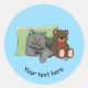 Cute grey British shorthair cat sitting with a cat toy and a teddy bear. The cat is hoping their previous mischief they got into is blamed on the dog.