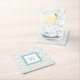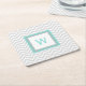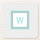 Stylish pulp board paper coasters done in a white and light grey chevron pattern. A aqua, grey and white square, in the middle of the coaster, has a aqua one letter monogram ready to personalise. Great for anytime use and makes a nice gift idea.