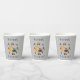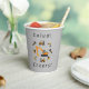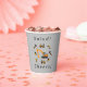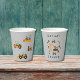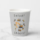 Grey cups for a boy birthday party, bilingual and customisable text with your own language. Text says: "Salud!" in Spanish and "Cheers" in English.