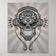 This elaborate DJ sugar skull design is decorated with intricate swirls and dot patterns. Headphones sit on top of the skull with two wires hanging below. Rays of light shine in every direction behind the skull which emanate from the centre of the pattern. This aggressive Day of the Dead inspired image is perfect for musicians and music lovers.