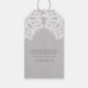 Simple and sophisticated Elegant Lace Wedding Gift Tags featuring a white lace doily motif on a light grey faux vintage paper background. These classic and stylish tags are perfect for a rustic wedding. Easy to customise with your wedding details. Click "Customise It" to find more personalisation options.