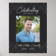 Black funeral poster or memorial poster with your loved one's photo, your loved one's name in a thin script and years living in elegant white fonts against a black background with faint grey greenery. A greenery memorial service poster with a large photo. Celebrating the life of poster personalised with your loved one's photo, name, and years living.