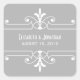 Simple and elegant Fancy Ornamental Wedding Stickers in grey and white featuring a sophisticated art deco style ornamental flourish border. Easy to customise, simply add your wedding details in the text fields provided. Click "Customise It" to find more personalisation options.