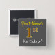 This simple square button design features a message like "First-Name’s 1st Birthday!", with the "1st" having a faux/imitation gold-like colouring look, on a grey (grey) coloured background. The name can be personalised. Buttons like these could perhaps be worn by guests at a birthday party for somebody who is celebrating their first birthday, where the party is being held in a large area with lots of other people present (such as a city park or a theme park). [~Z0000192]
