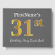 This guest book design features the ordinal number "31st" with a faux/imitation gold-like appearance. It also features a customised name, and a grey (grey) coloured background. It could be used at a birthday party for somebody who is celebrating their thirty first birthday. [~Z0000193]