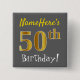 This simple square button design features a message like "NameHere’s 50th Birthday!", with the "50th" having a faux/imitation gold-like colouring look, on a grey (grey) coloured background. The name can be customised. Buttons like these could perhaps be worn by guests at a birthday party for somebody who is celebrating their fiftieth birthday, where the party is being held in a large area with lots of other people present (such as a city park or a theme park). [~Z0000192]