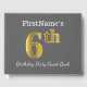 This guest book design features the ordinal number "6th" with a faux/imitation gold-like appearance. It also features a personalised name, and a grey (grey) coloured background. It could be used at a birthday party for somebody who is celebrating their sixth birthday. [~Z0000193]