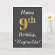 This simple birthday card design features the message "Happy 9th Birthday", with the "9th" having a faux gold-like appearance. It also features a custom name, and a grey background. It could be given to somebody who is celebrating their ninth birthday.