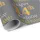 This wrapping paper design features a message like "HAPPY 14th BIRTHDAY", with the "14th" having a faux/imitation gold appearance. It also features a personalised name, and a grey (grey) coloured background. It could perhaps be used when wrapping gifts being given for somebody’s fourteenth birthday. [~Z0000187]