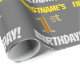This wrapping paper design features a message like "FIRSTNAME’S 1st BIRTHDAY!", with the "1st" having a faux/imitation gold-like colour appearance, and with the name and "BIRTHDAY" in a fun, bold font. The name can be personalised, and the background is coloured grey (grey). Wrapping paper like this could perhaps be used when wrapping birthday gifts being given to somebody in celebration of their first birthday. [~Z0000211]