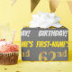 This wrapping paper design features a message like "FIRST-NAME’S 62nd BIRTHDAY!", with the "62nd" having a faux/imitation gold-like colour appearance, and with the name and "BIRTHDAY" in a fun, bold font. The name can be personalised, and the background is coloured grey (grey). Wrapping paper like this could perhaps be used when wrapping birthday gifts being given to somebody in celebration of their sixty second birthday. [~Z0000211]