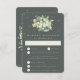 A dark grey green wedding response card with meal options. Featuring an elegant bouquet/posy of hand painted snowberries and eucalyptus on the front and a wreath on the back of the card. All text is fully editable and the scattered dots on the front and back can be deleted before ordering if you would prefer. This card is available with alternative botanical designs and in different colours. Please view the Collection in my store to see all options and coordinating items.