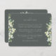 A dark grey green flat wedding reception enclosure card featuring an edging of hand painted snowberries and eucalyptus on the front and a wreath on the back of the card. All text is fully editable and the scattered dots on the front and back can be deleted before ordering if you would prefer. This card is available with alternative botanical designs, in a portrait format, and in different colours. Please view the Collection in my store to see all options and coordinating items.