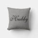 This illustrated grey linen cushion is decorated with fancy script that says "Hubby" on the front, and "Mr." on the back, making it perfect for the sweetheart table, sofa or bed of the newlyweds. Scroll down to see the coordinating Wifey / Mrs. cushion.