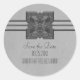 Regal and elegant Medallion Border Save the Date Stickers featuring a digital art metallic medallion and a three stripe border on a light grey background. These bold and stylish stickers are perfect for announcing your equally bold and stylish wedding. Easy to customise, simply add the details of your wedding in the text fields provided. Click on "Customise It" to find additional personalisation options such as changing fonts or text size.