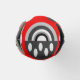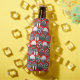 This bottle cooler has a geometric design of ovals with different patterns in grey in each half all on a field of red.
