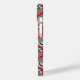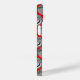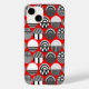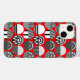 This phone case has a geometric design of ovals with different patterns in grey in each half all on a field of red.