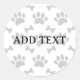 A pattern made of puppy paws and bones. Custom stickers in white and grey. Edit text to customise.