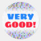 This sticker design features a grid-like abstract pattern of squares or tiles coloured shades of colours like grey, purple, beige and blue. It also features the encouraging saying "VERY GOOD!" in blue and red coloured text. Stickers like these could perhaps be used by teachers, educators or tutors to acknowledge and motivate a student who has done very good work on a test, quiz, paper, project, or some other school or academic assignment. [~Z0000118]