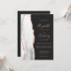The left-hand edge of this elegant modern wedding invitation features a grey and white watercolor agate border trimmed with faux rose gold glitter. The customisable text combines rose coloured handwriting, copperplate and italic fonts in on a slate black background. The reverse side provides space for wedding details on a solid slate background, along with a QR code guests can scan to visit your website and RSVP, which saves the cost of printing and mailing separate RSVP cards.