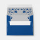 This customisable grey and royal+blue A2 size wedding invitation envelope matches the Royal Blue, Grey Love Hearts Wedding Invitation set and is designed to fit the A2 size RSVP card. This custom A2 envelope has a royal blue background on the outside with an inner grey colour. There are silver look flowers on the front side and royal blue flowers on the inside. Your name and return address is in grey on the centre front of the envelope as it gets mailed back to you.