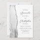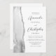 The left-hand edge of this elegant modern wedding invitation features a grey and white watercolor agate border trimmed with faux silver glitter. The customisable text combines charcoal grey script and sans serif fonts on a white background. The reverse side provides space for wedding details, along with a QR code guests can scan to visit your website and RSVP, which saves the cost of printing and mailing separate RSVP cards.