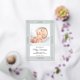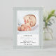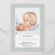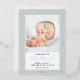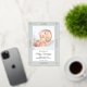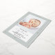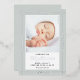 Grey and silver foil adopted baby announcement, introducing your adopted baby with chosen, loved, wanted, adopted in silver text surrounding a photo of your baby. Their name in a silver foil script.