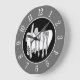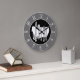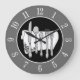 An elegant dining clock with a set of silverware on a white embellished table napkin in shades of grey on a black inner circle, with white numbers on a dark grey background. Customise It to add your name or restaurant, change background colours, even save your designs for later.