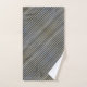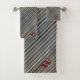 A sophisticated bath towel set in smokey waves of diagonal stripes in black, taupe and grey and an edgy modern monochromatic smokey grey design with personalised Monograms in deep red on each size towel. See the coordinating Bed and Bath Collection for shower curtain, bath mat and more.