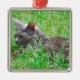This item displays a photograph of a grey tortie cat resting in the grass.