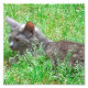 This item displays a photograph of a grey tortie cat resting in the grass.