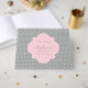 White on grey polka dot pattern with pastel pink accent baby shower guset book. The design features a white and grey polka dot pattern and a quatrefoil shape with your custom text.