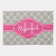 Stylish, trendy grey and white lattice pattern in the background, topped with a hot pink label featuring a customisable name and monogram template.