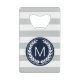 Modern grey and white wide striped pattern with custom laurel wreath logo monogram in navy blue to add your own initial, name or text - personalised credit card bottle openers.