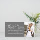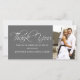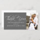 Gorgeous Wedding Thank You Photo Card with a lovely white script font for the words "Thank You" on a solid colour background of your choice. Shown here with a grey background colour with an simple yet elegant design for the text and photo. A perfect way to send a heartfelt thank you to your wedding guests and provide each with a wedding photo of the newly weds. Design by Elke Clarke ©2011. Choose your background colour add your bride and groom names, message and wedding date. Exchange this sample photo for your own. Chose "customise it" for more flexibility to position and size your photo and move the text to best suit the layout. Congratulations Newly Weds!