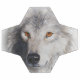 Face of a grey timber wolf with bright orange eyes. Realistic artwork created from an original oil painting by equine and wildlife artist Crista S. Forest.