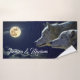 A pair of grey wolves shine under a full moon. This is a beautiful design for a couple.