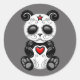 This unique design features an adorable sitting baby panda bear decorated with light grey swirls and drops. A large heart is in the middle of the bear's chest with a small five point star appearing at the top of the forehead. These simple patterns are inspired by the Day of the Dead sugar skulls as are the flower pedals surrounding each dark eye. The stitched mouth also gives the panda a cute zombie appearance. This cute symmetrical design is a unique representation of this beautiful creature.